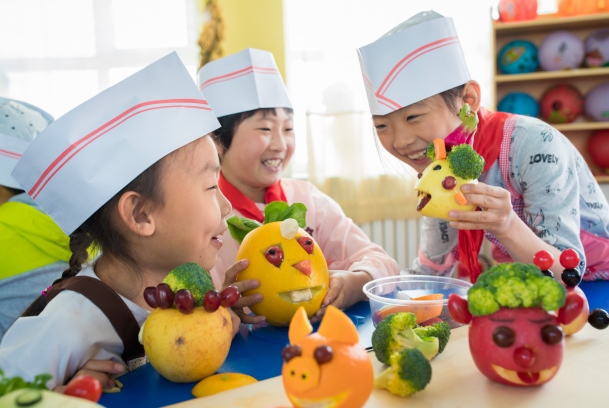 呼和浩特市五塔寺東街小學的學生在制作“果蔬笑臉”。