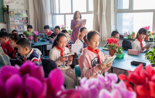 呼和浩特市通順街小學的學生們在朗讀課文。