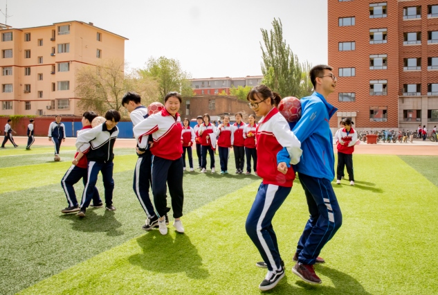 呼和浩特市第六中學的學生在操場上做趣味游戲。