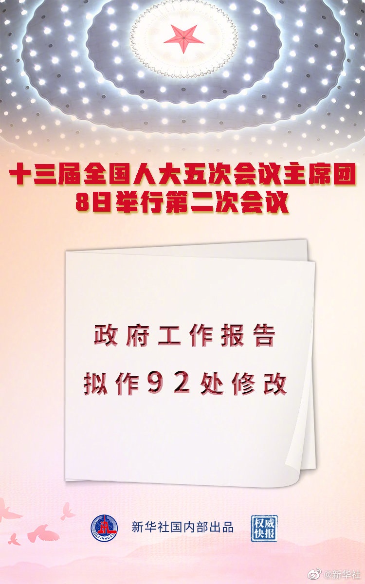 記者8日從十三屆全國人大五次會議主席團(tuán)第二次會議上獲悉,政府工作報(bào)告擬作92處修改?! ?br/>