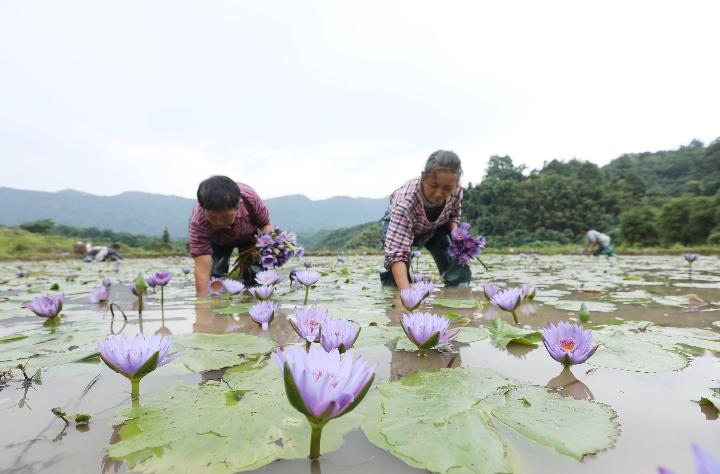 2022年6月28日,在貴州省赤水市寶源鄉(xiāng)玉豐村,村民在采摘香水蓮花。近年來,貴州省赤水市寶源鄉(xiāng)采取“黨支部+合作社+農(nóng)戶”模式,引導(dǎo)農(nóng)民種植集觀賞、藥用、食用為一體的香水蓮花,帶動(dòng)農(nóng)民增收,助力鄉(xiāng)村振興。新華社發(fā)(王長(zhǎng)育 攝)