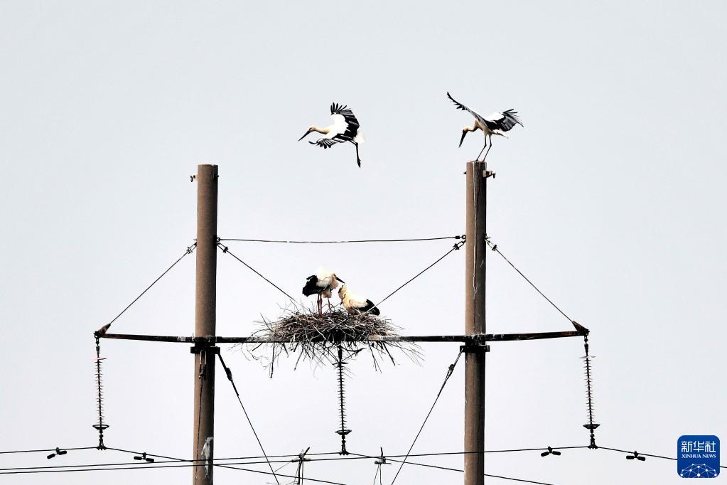 這是山東黃河三角洲國(guó)家級(jí)自然保護(hù)區(qū)電線(xiàn)桿上的東方白鸛的巢(2021年5月13日攝)。新華社記者郭緒雷攝