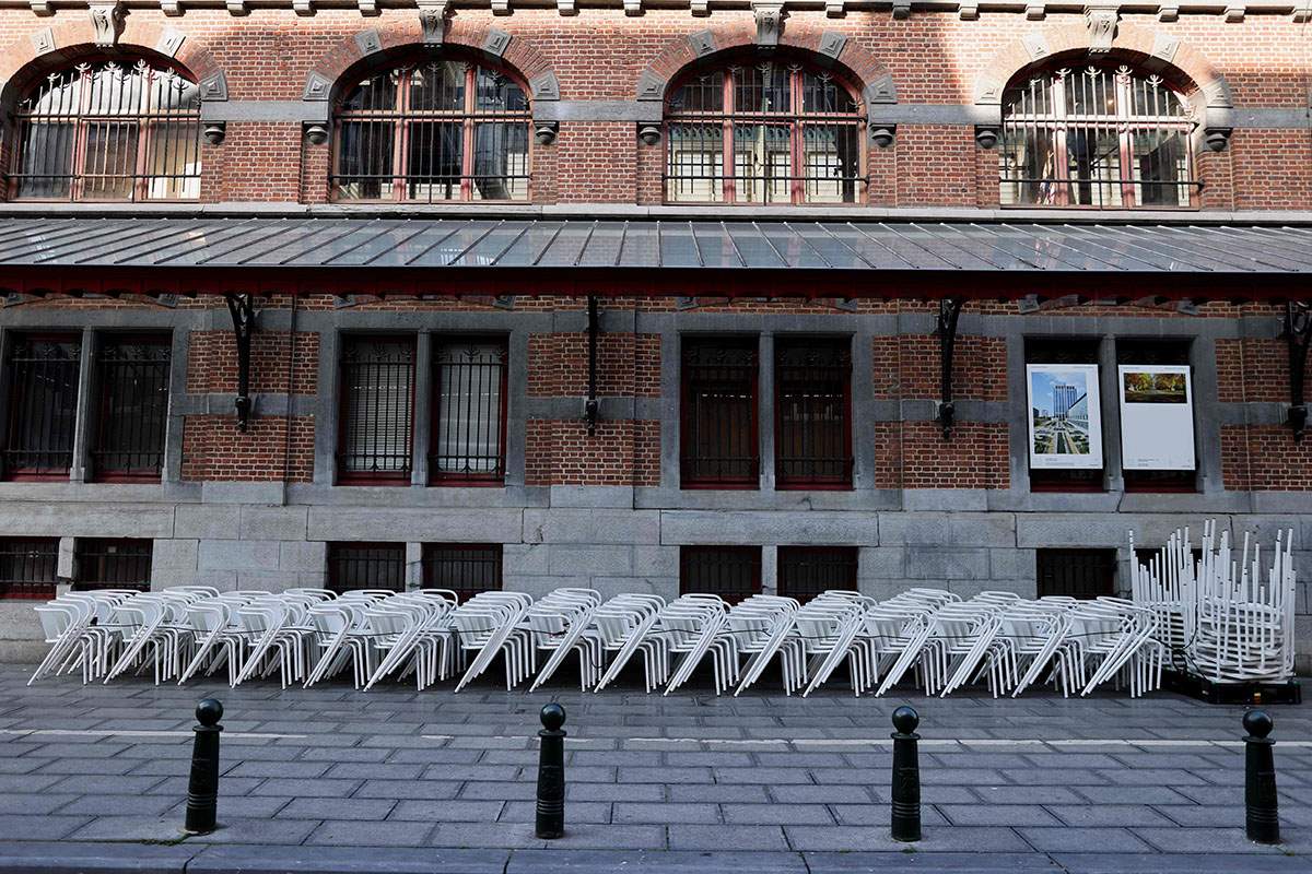 當?shù)貢r間2020年10月19日,比利時布魯塞爾,一家關(guān)閉的餐館外的排椅。 -