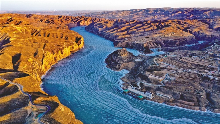 準格爾黃河大峽谷,龍鱗狀的藍色冰面,猶如一條長龍蜷伏于崇山峻嶺間。文/圖 徐秋利